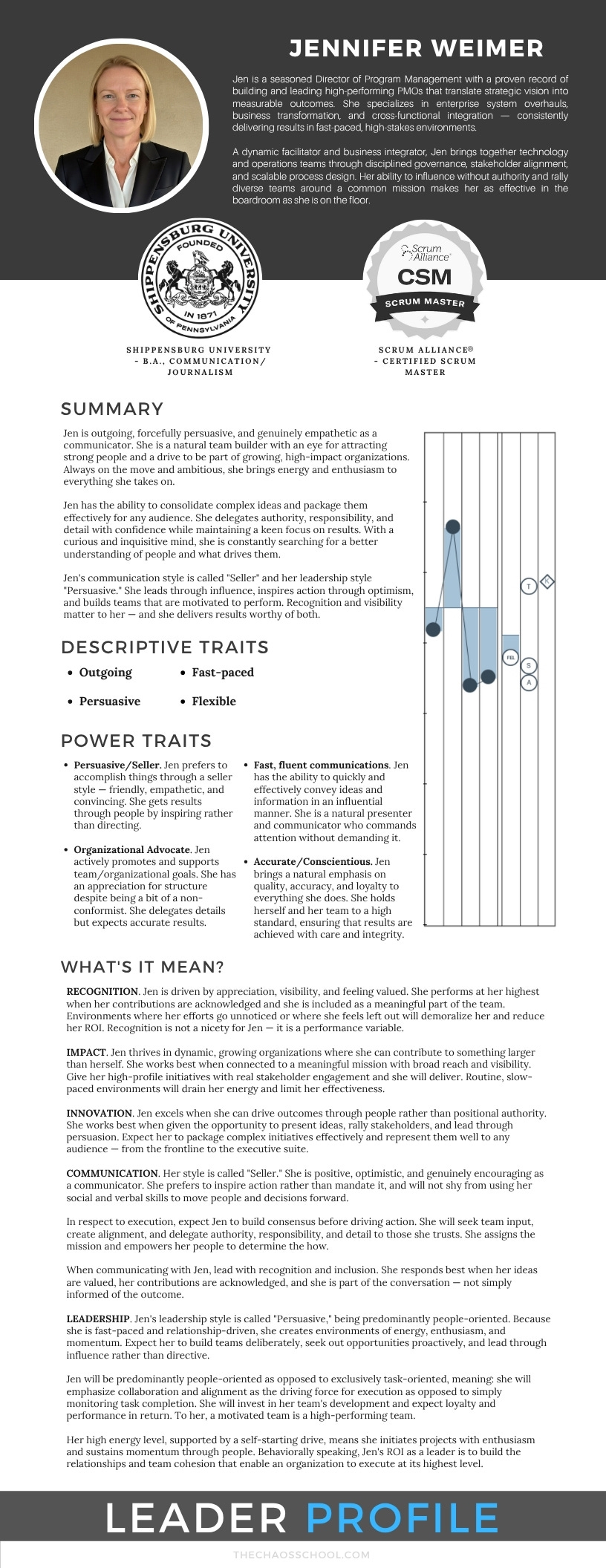 The Leader Profile is a Chaos Studies-based behavioral assessment that maps how an individual leader communicates, makes decisions, builds trust, and responds when conditions become unstable. It identifies their natural strengths, their behavioral blind spots, and the conditions that either elevate or limit their performance.